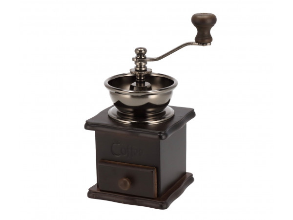 Mlýnek na kávu vyrobený ze dřeva dle tradičního vzoru s železným strojkem a kovovým zásobníkem.